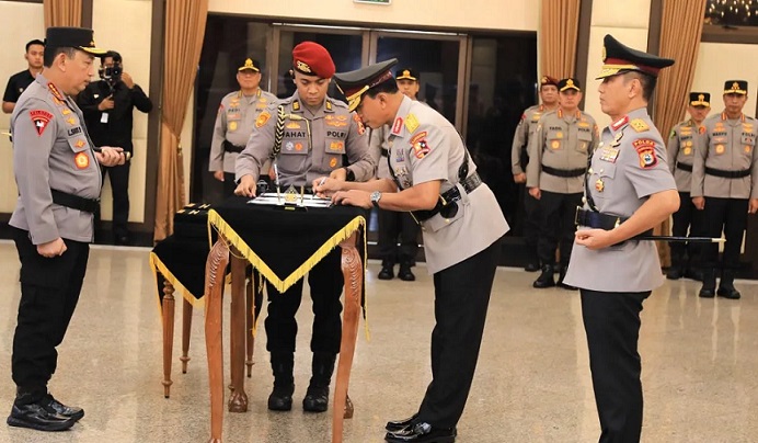 JAKARTA, KAREBASULSEL – Kapolri Jenderal Polisi Listyo Sigit Prabowo melantik Irjen Pol. Rusdi Hartono sebagai Kepala Kepolisian Daerah (Kapolda) Sulawesi Selatan menggantikan Irjen Pol. Yudhiawan di Aula Rupatama Mabes Polri, Jakarta, Jumat (14/3/2025).