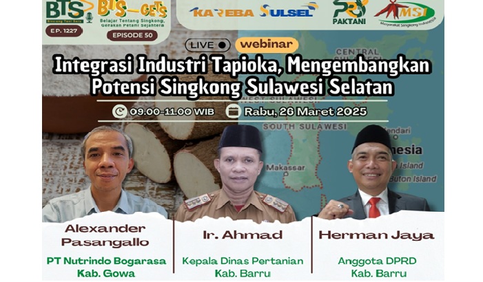 Adapun webinar yang akan digelar pada Rabu (26 Maret 2025) mengambil tema “Integrasi Industri Tapioka, Mengembangkan Potensi Singkong Sulawesi Selatan” menghadirkan sejumlah narasumber dari industri tapioka, lalu pihak Dinas Pertanian Kabupaten Barru dan DPRD Barru-Sulawesi Selatan. Bagi caloin peserta yang ingin bergabung dalam webinar tersebut bisa menghubungi KarebaSulsel.com melalui +62 821 9291 0929 atau redaksi@karebasulsel.com.