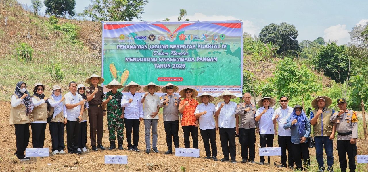 BARRU, Karebasulsel.com., – Mendukung program swasembada pangan nasional tahun 2025, Kapolres Barru AKBP Ananda Fauzi Harahap, S.I.K., M.H bersama Forkopimda Kabupaten Barru mengikuti kegiatan Penanaman Jagung Serentak Kuartal IV Tahun 2025 yang digelar di Desa Pao-Pao, Kecamatan Tanete Rilau, Rabu (8/10/2025).