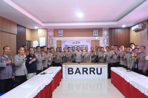 Kegiatan dipimpin langsung oleh Kapolres Barru AKBP Ananda Fauzi Harahap, S.I.K., M.H., dan dihadiri oleh para pejabat utama Polres Barru, di antaranya Kasat Binmas AKP Sudarto, S.Sos., M.P., Kasat Intelkam AKP Adam, S.H., serta seluruh personel Bhabinkamtibmas jajaran Polres Barru.